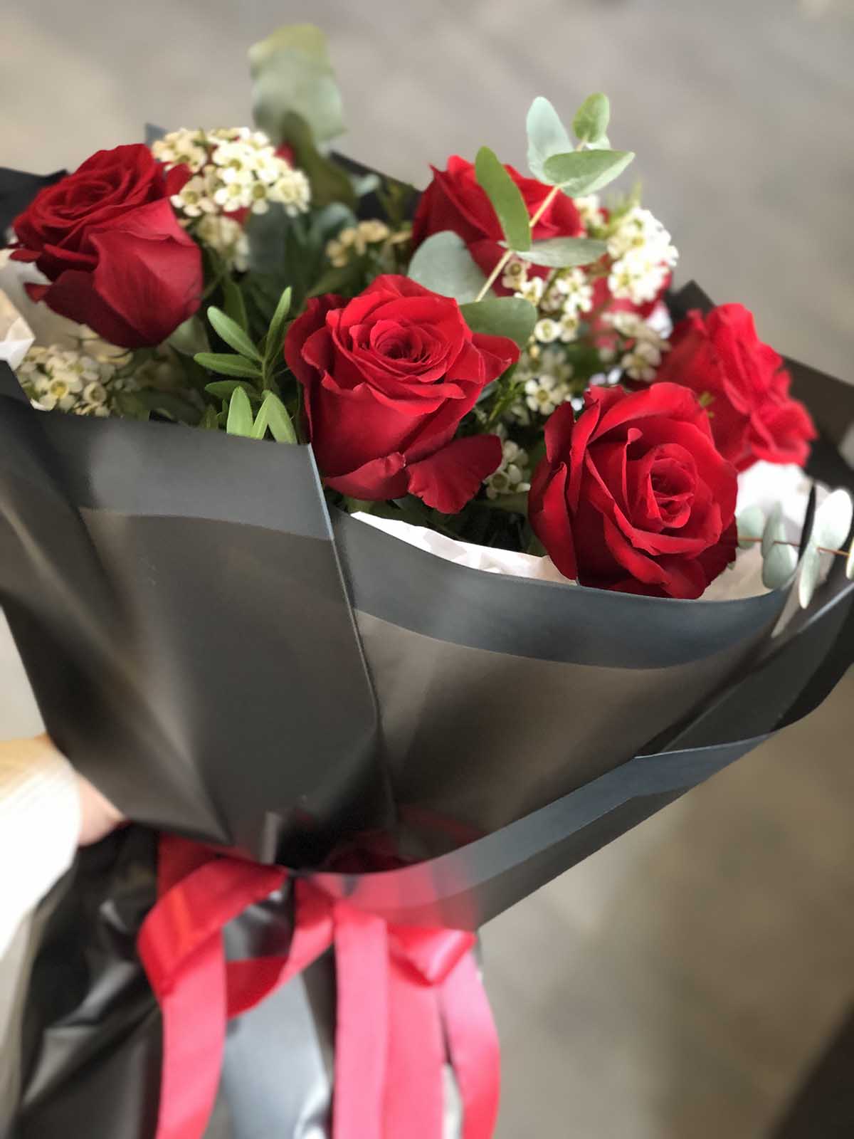 Одноголовая роза красная 7 шт, эвкалипт, хамелациум