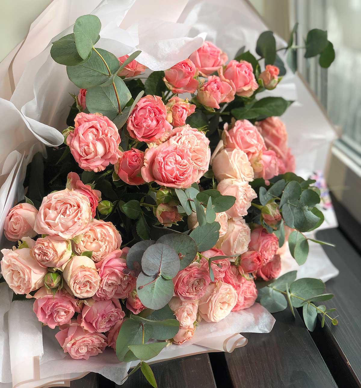Пионовидная кустовая роза 9 шт, эвкалипт