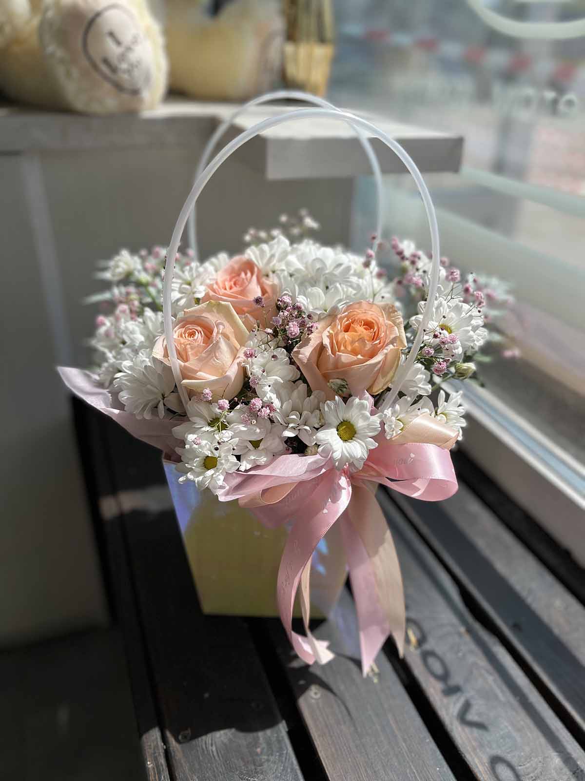 Хризантема ромашковая, розы одноголовые, гипсофил