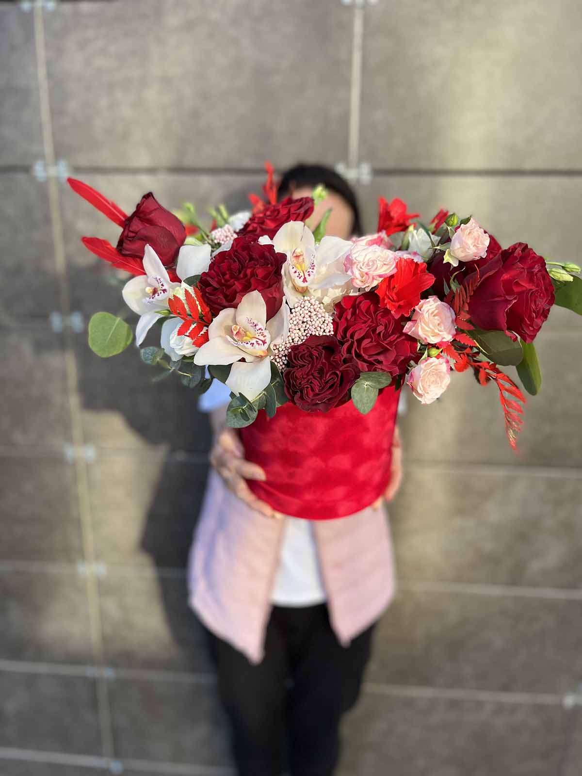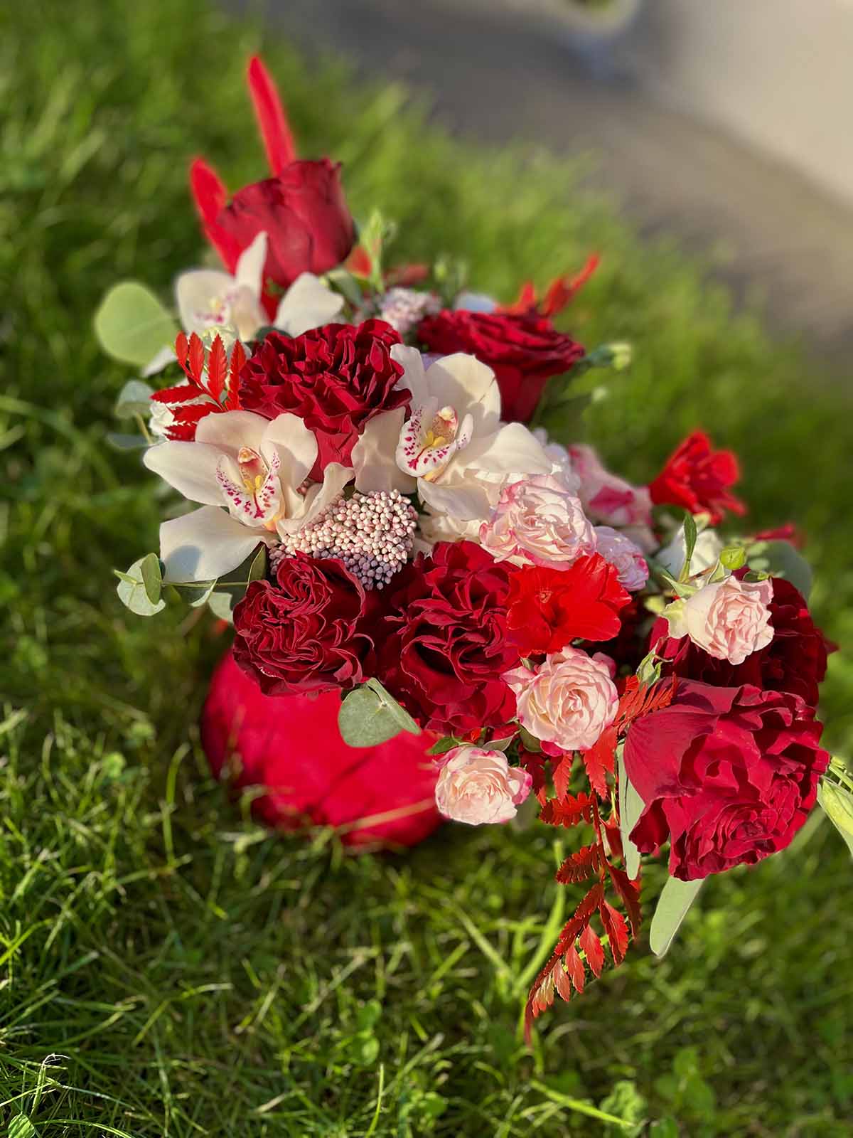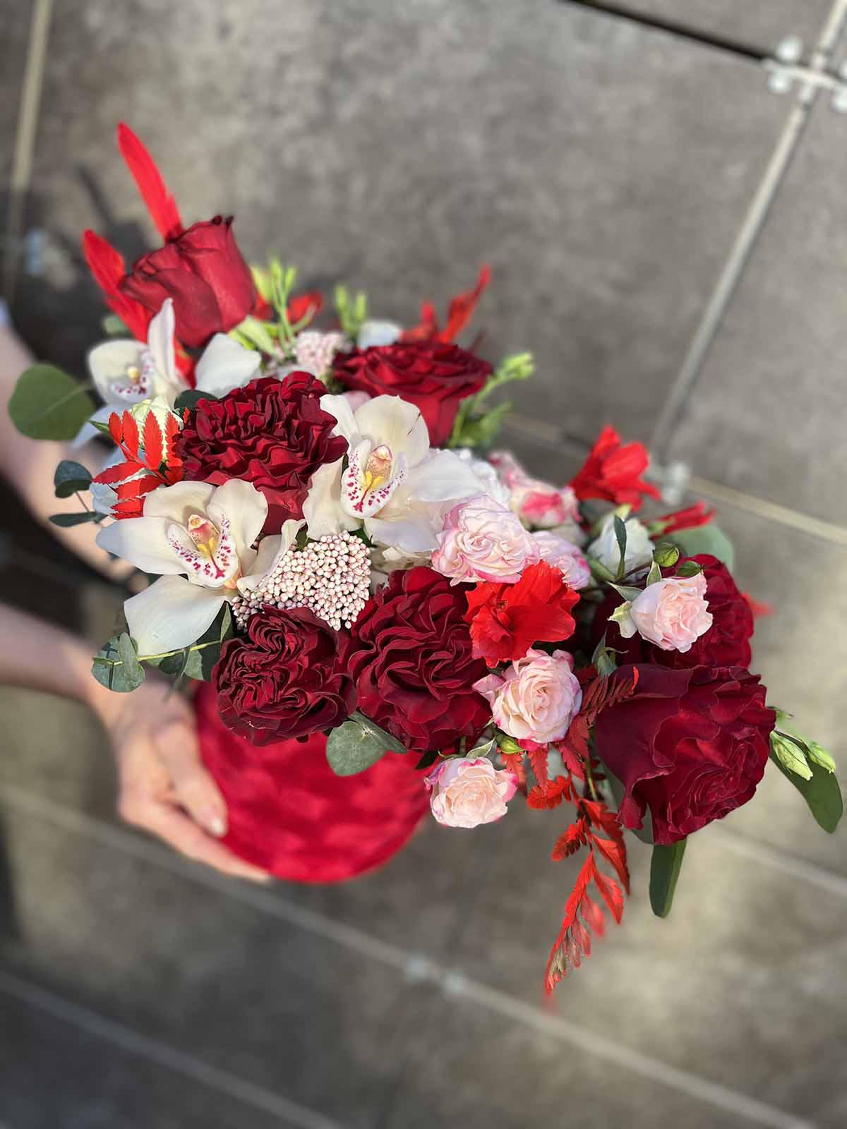 Розы одноголовые, розы кустовые, орхидеи, озотамнус, эвкалипт, сухоцветы, зелень, бархатная коробочка