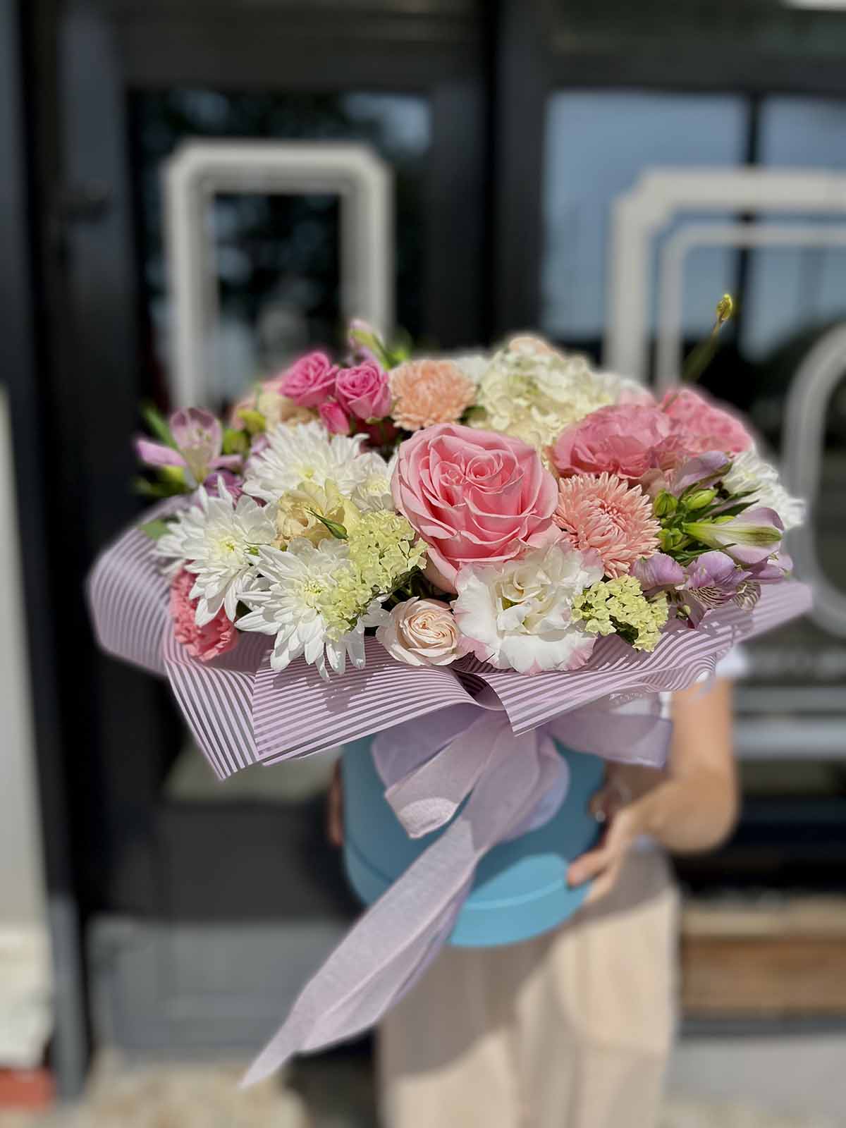 Розы одноголовые, розы кустовые, гвоздика, альстромерия, статица, хризантема, эустома